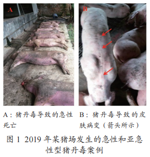 根據(jù)臨床發(fā)病緩急豬丹毒可以被分為:急性型、亞急性型以及慢性關(guān)節(jié)炎和心內(nèi)膜炎型。急性豬丹毒的特征是突然發(fā)病(圖1A),甚至突然死亡而不表現(xiàn)出任何癥狀(容易與傳染性胸膜炎、急性非洲豬瘟混淆),多數(shù)豬會(huì)出現(xiàn)體溫升高到40~42℃,甚至更高,發(fā)病后存活的豬只5~7d后體溫會(huì)恢復(fù)正常。
