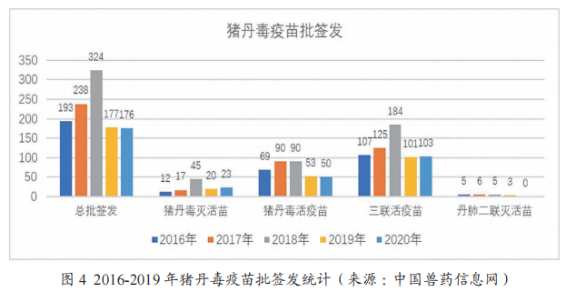 從收集整理的數(shù)據(jù)來看,國內(nèi)商品化的豬丹毒疫苗品種有4種,豬丹毒滅活、豬丹毒活苗、豬丹毒-豬肺疫-豬瘟三聯(lián)活疫苗和豬丹毒-豬肺疫二聯(lián)滅活疫苗,疫苗的使用大大降低了豬丹毒病的發(fā)生率,特別是三聯(lián)活疫苗在一定時(shí)期給我國豬瘟-豬肺疫-豬丹毒的聯(lián)合防控發(fā)揮了非常重要的作用。截止2020年,共有21家生產(chǎn)企業(yè)獲得豬丹毒疫苗的生產(chǎn)批文,從2016-2020年批簽發(fā)數(shù)據(jù)可以看出,三聯(lián)活疫苗的使用量最大,其次為活疫苗單苗和滅活疫苗(圖4)。然而,一些學(xué)者認(rèn)為豬瘟-豬肺疫-豬丹毒三聯(lián)疫苗,由于存在著3種不同病原成分,相比活疫苗單苗會(huì)存在更高的安全隱患特別是在母豬、個(gè)體弱、發(fā)病的豬免疫時(shí)可能會(huì)導(dǎo)致嚴(yán)重的副反應(yīng),其次隱性感染豬只接種弱毒疫苗時(shí)還有引起疾病暴發(fā)的風(fēng)險(xiǎn)。