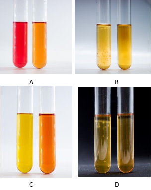 圖C:支原體肉湯培養(yǎng)結(jié)果,左邊黃色為陽(yáng)性,右邊橙色為陰性;